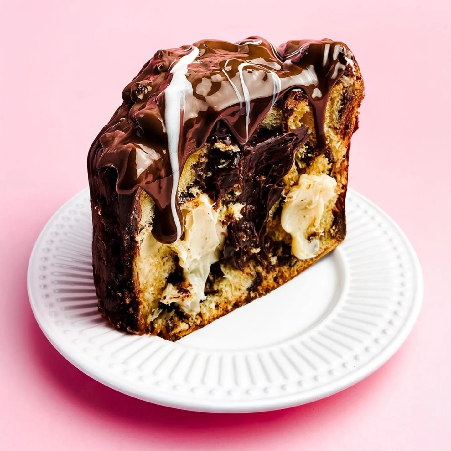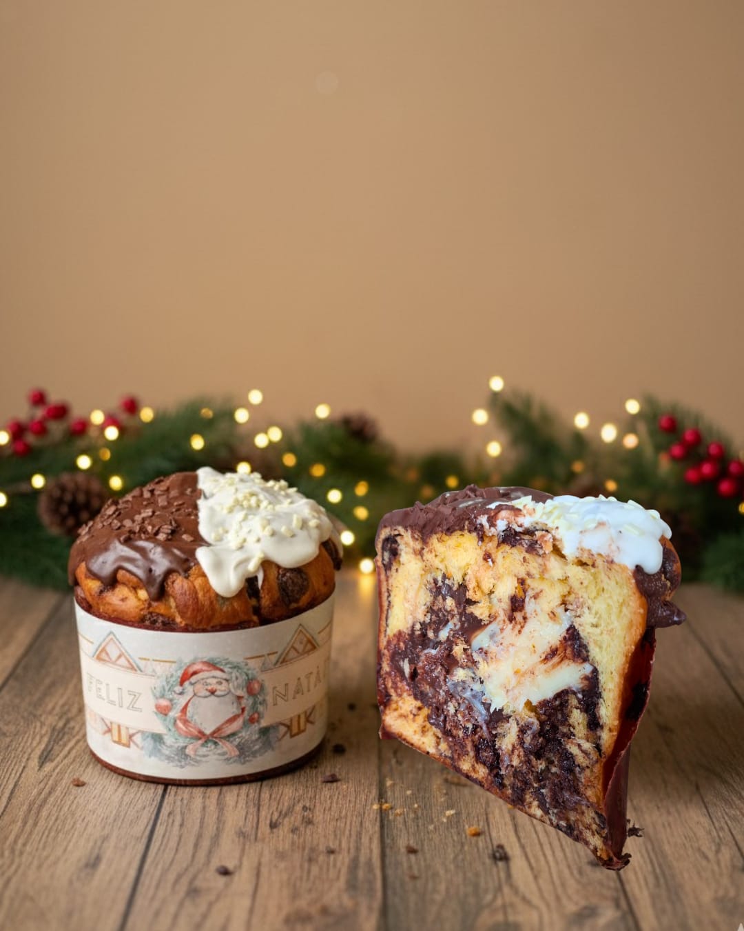 Chocotone artesanal com recheio de brigadeiro preto e branco e cobertura de chocolate ao leite e chocolate branco.
