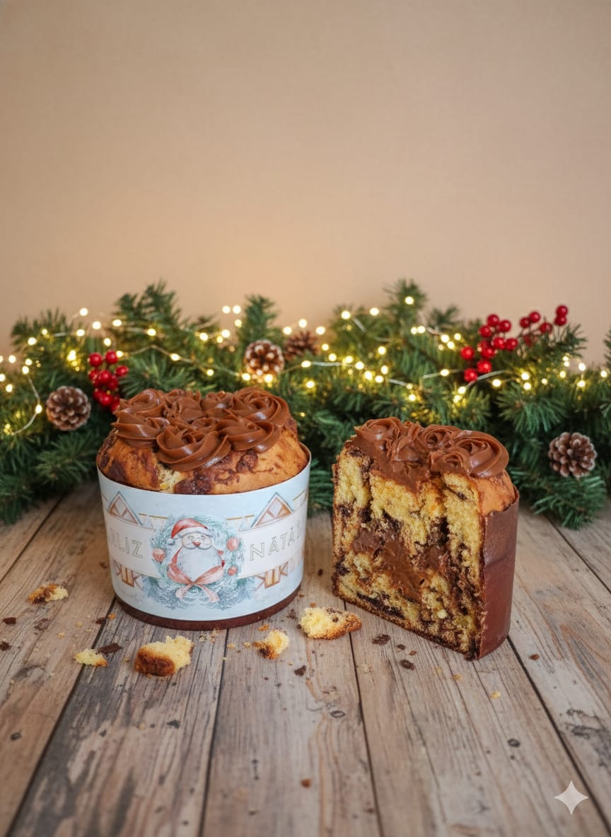 Chocotone artesanal com recheio e cobertura de doce de leite.
