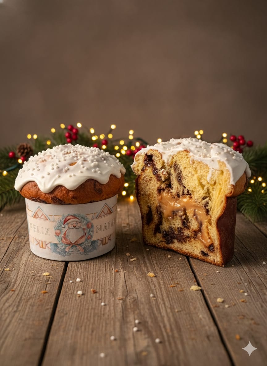 Chocotone artesanal recheado com creme de limão siciliano e com cobertura de chocolate branco.