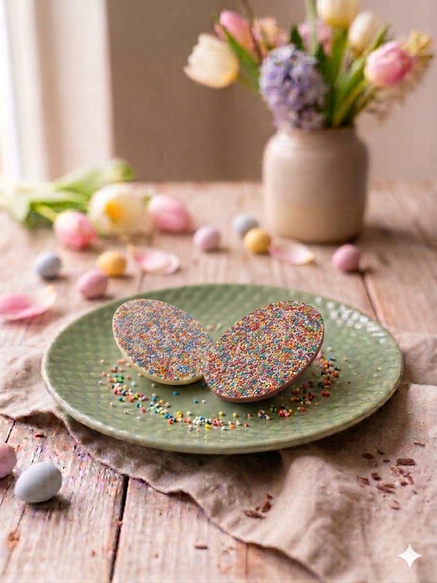 Ovo de Páscoa tablete de chocolate ao leite ou branco com confeito miçanga. Aproximadamente 40g.