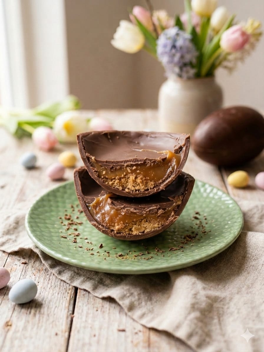 Ovo de Páscoa trufado com casquinha de chocolate ao leite e recheio de caramelo e praliné de amendoim.